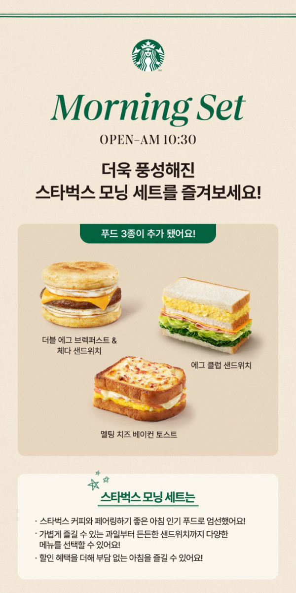 앞서 스타벅스는 작년 9월 오전 10시30분까지 음료와 음식으로 구성된 세트 메뉴를 구매하면 할인해주는 ‘스타벅스 모닝 세트’를 출시해 현재까지 운영 중이다. 톨 사이즈 아메리카노 또는 라떼를 행사 대상 식품과 함께 구매하면 최대 1500원 할인 혜택을 제공한다.