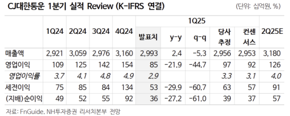 CJ대한통운의 1분기 매출액은 전년 동기 대비 2.4% 증가한 2조9926억 원, 영업이익 21.9% 감소한 854억 원으로 어닝 쇼크를 기록했다. 정 연구원은 "비수기 및 신규 프로젝트로 인한 수익성이 하락한 영향"이라며 "내수 부진과 단가 인상에 따른 고객 이탈 영향으로 주7일 배송 서비스 효과가 나타나지 않았다"고 설명했다.