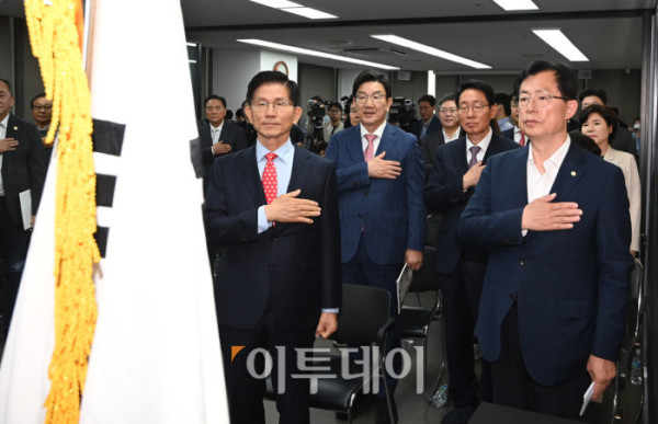 ▲김문수(왼쪽) 국민의힘 대선후보를 비롯한 참석자들이 20일 서울 양천구 대한민국예술인센터에서 열린 한국예술문화단체총연합회-국민의힘 정책협약식에서 국민의례를 하고 있다. 조현호 기자 hyunho@