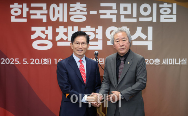 ▲김문수(왼쪽) 국민의힘 대선후보와 조강훈 한국예술문화단체총연합회장이 20일 서울 양천구 대한민국예술인센터에서 열린 한국예술문화단체총연합회-국민의힘 정책협약식에서 악수를 하고 있다. 조현호 기자 hyunho@