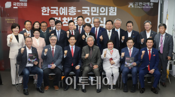 ▲김문수(앞줄 왼쪽 세 번째) 국민의힘 대선후보와 조강훈(앞줄 가운데) 한국예술문화단체총연합회장 등 참석자들이 20일 서울 양천구 대한민국예술인센터에서 열린 한국예술문화단체총연합회-국민의힘 정책협약식에서 기념촬영을 하고 있다. 조현호 기자 hyunho@