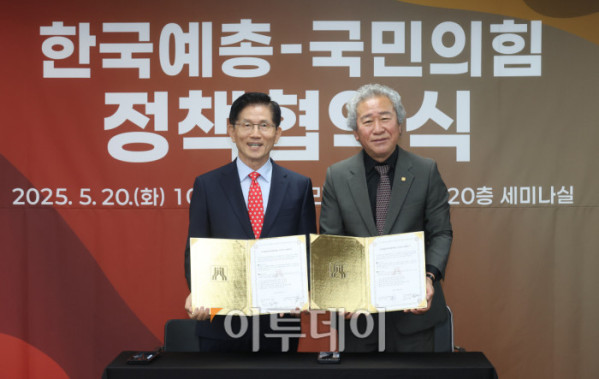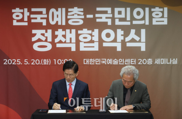 ▲김문수(왼쪽) 국민의힘 대선후보와 조강훈 한국예술문화단체총연합회장이 20일 서울 양천구 대한민국예술인센터에서 열린 한국예술문화단체총연합회-국민의힘 정책협약식에서 협약서에서 사인하고 있다. 조현호 기자 hyunho@