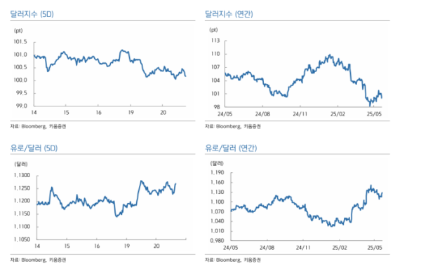 ◇김유미 키움증권 연구원= 달러화는 무디스의 미국 신용등급 하향 이후 재정 우려가 부각된 가운데, 연준 위원들의 금리 인하 기대를 낮추는 매파적 발언에도 불구하고 약세 흐름을 이어가고 있다. 이번 주 예정된 미·일 무역협상을 앞두고 엔화 절상 이슈가 부각되며 엔화는 달러 대비 강보합권에서 등락했다.