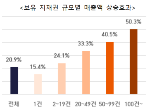 지식재산권을 얼마나 많이 보유하고 있는지도 기업의 매출 실적에 큰 영향을 미치는 것으로 나타났다. 보고서에 따르면 지식재산권을 1건만 보유한 기업은 미보유 기업에 비해 종업원 1인당 매출액이 15.4% 높은 반면, 2건에서 19건을 보유한 기업은 24.1%, 100건 이상을 보유한 기업은 무려 50.3%나 높은 것으로 분석됐다. 이는 지식재산권의 양적 확대도 기업 성장에 크게 기여함을 보여준다.