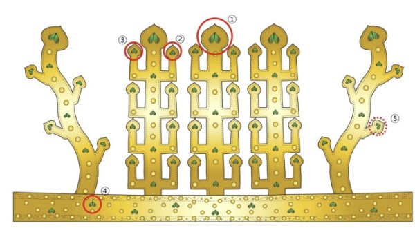 ▲금동관 모식도 (① 출자형 세움장식 중앙 끝단 3매 / ②,③ 출자형 세움장식 좌우 끝단 각 1매 / ④ 관테 1매 /⑤사슴뿔형 세움장식 1매) (국가유산청)