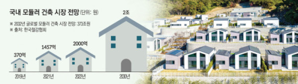 한국철강협회에 따르면 국내 모듈러 시장은 2021년 1457억 원에서 2022년 약 2000억 원 규모로 증가했다. 2030년에는 2조 원까지 불어날 것으로 예상된다. 나아가 세계 모듈러 시장은 2032년 373조 원 규모까지 성장할 것으로 관측된다.