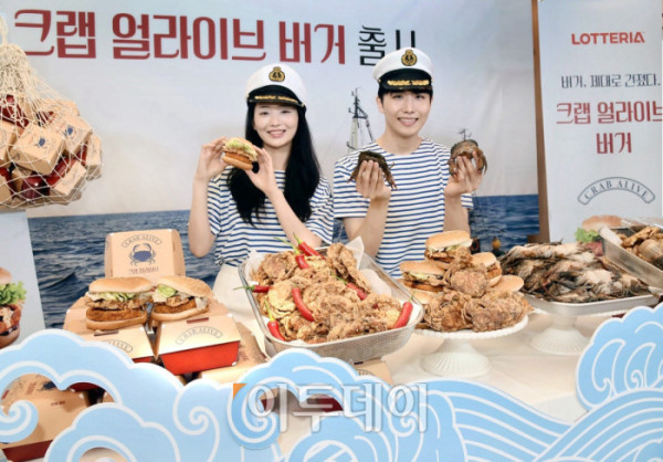 21일 서울 롯데리아 동대문역사문화공원역점에서 열린 롯데리아 신제품 '크랩 얼라이브 버거' 출시행사에서 모델들이 제품을 소개하고 있다. 이번 제품은 부드러운 소프트쉘크랩 한 마리를 그대로 튀겨 활용한 버거로, 오징어 패티 위에 얹어 바다의 풍미를 더한 것이 특징이며 한국인의 기호에 맞춘 '매운맛'과 크랩 요리와 어울리는 '블랙페퍼맛' 두 가지로 선보인다. 사진제공=롯데GRS