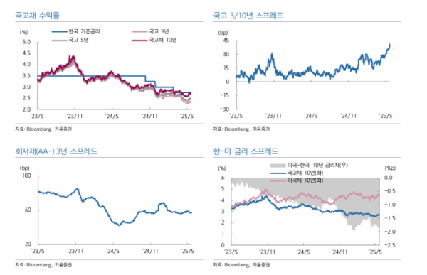 미국 20년물 국채 입찰 부진과 재정건전성 우려가 겹치면서 미국 장기 국채금리가 급등하고 있다. 이 영향으로 국내 채권시장도 장기물을 중심으로 약세 흐름이 뚜렷해지며, 수익률 곡선이 가팔라지는 '커브 스티프닝(Curve Steepening)' 현상이 나타나고 있다.