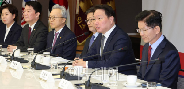 ▲최태원 대한상공회의소 회장이 22일 서울 중구 대한상공회의소에서 열린 김문수 국민의힘 대선후보-경제5단체 간담회에서 모두발언을 하고 있다. 조현호 기자 hyunho@