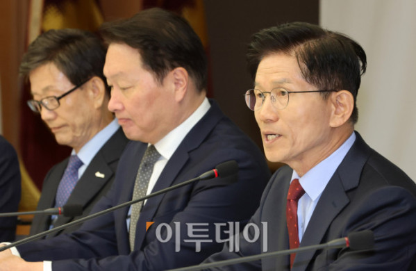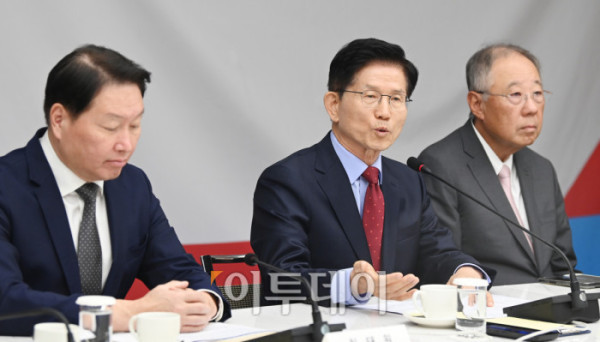 ▲최태원 대한상공회의소 회장이 22일 서울 중구 대한상공회의소에서 열린 김문수 국민의힘 대선후보-경제5단체 간담회에서 모두발언을 하고 있다. 조현호 기자 hyunho@