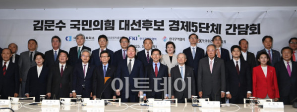 ▲김문수(앞줄 왼쪽 일곱 번째) 국민의힘 대선후보와 최태원(앞줄 왼쪽 여섯 번째) 대한상의 회장을 비롯한 경제5단체장 및 참석자들이 22일 서울 중구 대한상공회의소에서 열린 김문수 국민의힘 대선후보-경제5단체 간담회에서 기념촬영을 하고 있다. 조현호 기자 hyunho@
