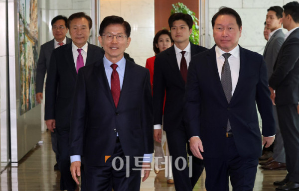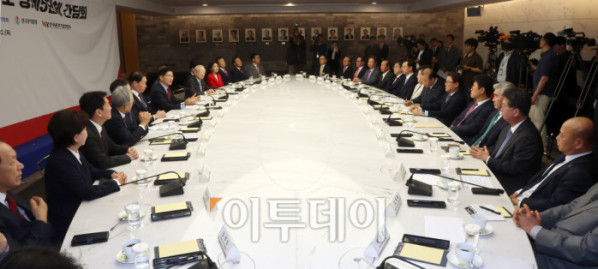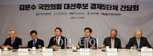 ▲김문수(왼쪽) 국민의힘 대선후보와 최태원 대한상공회의소 회장이 22일 서울 중구 대한상공회의소에서 열린 김문수 국민의힘 대선후보-경제5단체 간담회에 참석하고 있다. 조현호 기자 hyunho@
