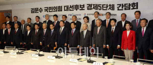 김문수(앞줄 왼쪽 일곱 번째) 국민의힘 대선후보와 최태원(앞줄 왼쪽 여섯 번째) 대한상의 회장을 비롯한 경제5단체장 및 참석자들이 22일 서울 중구 대한상공회의소에서 열린 김문수 국민의힘 대선후보-경제5단체 간담회에서 기념촬영을 하고 있다. 조현호 기자 hyunho@