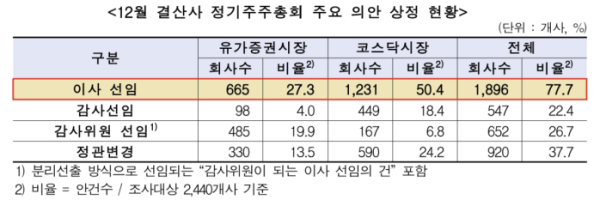 정기주총이 특정 기간에 집중되는 현상도 여전했다. 3월 26일(544개사), 28일(571개사), 31일(512개사) 등 3일간 전체 상장사의 66.7%가 정기주총을 열었다. 전년(70.8%) 대비 소폭 감소했으나 여전히 높은 수준이었다.