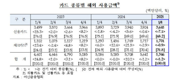 한국은행이 23일 발표한 ‘2025년 1분기 중 거주자의 카드 해외 사용실적’에 따르면 1분기 거주자의 카드(신용+체크) 해외 사용금액은 53억5000만 달러로 집계됐다. 올해 1분기 평균 원·달러 환율(주간거래 종가 기준) 1452.91원을 적용해 단순 계산하면 원화 환산액은 7조7730억 원에 달한다.