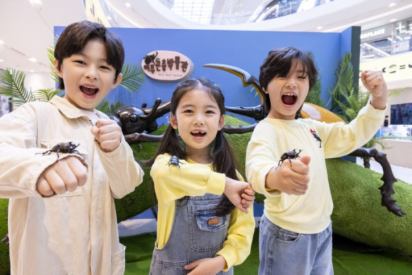 ▲스타필드 고양에서 열린 여주곤충박물관 팝업스토어 ‘신비한 곤충랜드’에서 어린이 모델들이 곤충과 함께 기념사진을 찍고 있다. (사진제공=신세계프라퍼티)