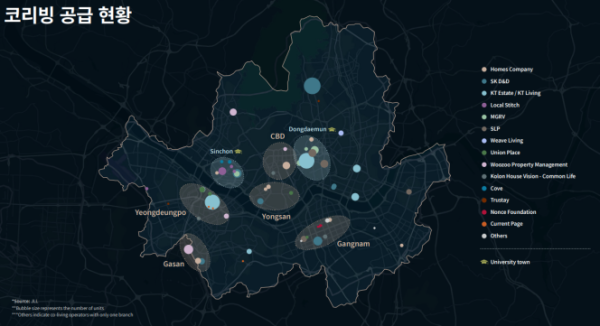 현재 코리빙 시장의 성장세는 기업형 임대주택 시장의 확장과 밀접한 연관성을 띈다. 신촌과 도심, 동대문, 용산, 영등포, 강남, 가산 등지에 코리빙 공급이 집중되면서 경쟁이 심화되고 있으며 이는 임대료 상승의 주요 원인 중 하나로 작용하고 있다.