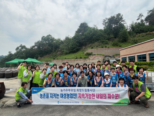 ▲여주현 농가주부모임경기도연합회 회장을 비롯한 참가자들이 23일 양평 지평농협 전통장류가공공장에서 '농가주부모임 희망드림 봉사단' 현수막을 들고 단체 사진을 촬영하고 있다. (경기농협)