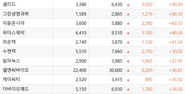 24일 한국거래소에 따르면 이 기간 코스닥 시장에서 가장 많이 상승한 종목은 셀리드로 90.24% 오른 6430원에 거래를 마쳤다. 중화권과 태국을 중심으로 코로나19 재확산 우려가 커지며 백신 개발업체인 셀리드에 매수세가 몰린 것으로 풀이된다. 이 외에도 그린생명과학(80.30%), 수젠텍(39.02) 등 코로나 관련주가 함께 상승세를 탔다.