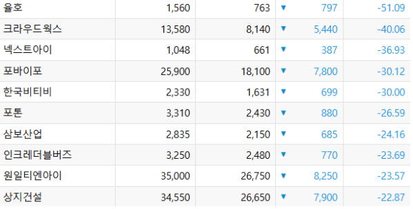 크라우드웍스(-40.06%), 넥스트아이(-36.93%), 포바이포(-30.12%) 등도 약세였다. 크라우드웍스의 경우 유상증자 결정 소식이 주가 하락에 영향을 미친 것으로 분석된다. 크라우드웍스는 344억 원 규모 유상증자를 결정했다고 21일 공시했다.