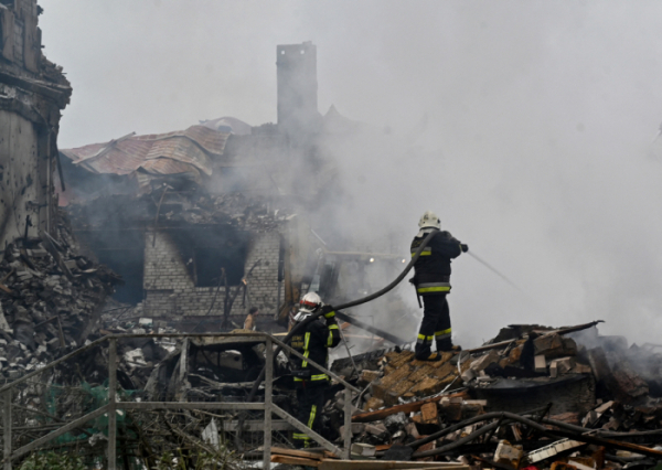 ▲25일(현지시간) 우크라이나 키이우에서 소방관들이 화재를 진압하고 있다. 키이우(우크라이나)/AFP연합뉴스