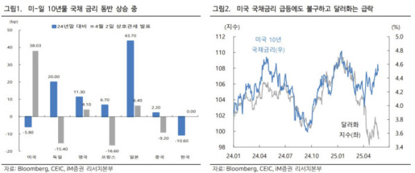 이어 "이전과 달리 미국 국채 금리 상승 시 '셀(Sell) USA' 우려로 달러화가 약세를 보이고 있다. 미국 국채 금리와 더불어 초장기물을 중심으로 급등세가 이어지고 있는 일본 국채 금리의 추이도 주목해야 한다"고 짚었다.