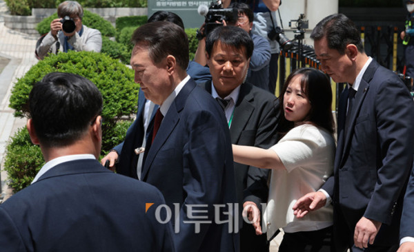 ▲윤석열 전 대통령이 26일 서울 서초구 서울중앙지방법원에서 열린 내란 우두머리 혐의ㆍ직권남용 권리행사 방해 혐의 사건 5차 오전 공판을 마친 뒤 차량으로 향하고 있다. 사진공동취재단