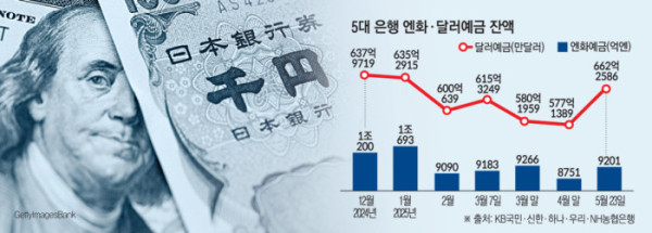 엔화예금 잔액도 반등 흐름을 보이고 있다. 4월 말 기준 8751억 엔까지 줄었던 5대 은행의 엔화예금 잔액은 9201억 엔으로 3주 만에 450억 엔(약 4306억 원) 유입됐다. 이는 지난 3월 말(9266억엔)과 비슷한 수준으로 회복된 것이다.