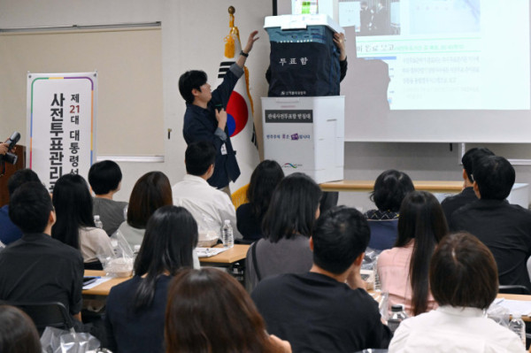 제21대 대통령선거 사전투표일을 사흘 앞둔 26일 서울 중랑구선거관리위원회에서 대선 사전투표관리관 교육이 열리고 있다.
