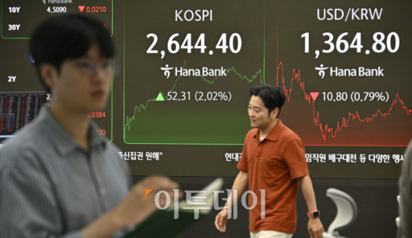▲국내 증시가 미국 EU(유럽연합) 관세 유예에 외국인과 기관이 동반 순매수하며 상승세로 마감한 26일 서울 중구 하나은행 딜링룸 전광판에 코스피, 원·달러 환율이 표시돼 있다. 이날 코스피는 전 거래일보다 52.31(2.02%) 상승한 2644.40을 나타냈다. 원·달러 환율은 종가 기준 1364.80원을 나타내며 7개월만에 최저 수준을 나타냈다. 조현호 기자 hyunho@