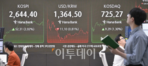 국내 증시가 미국 EU(유럽연합) 관세 유예에 외국인과 기관이 동반 순매수하며 상승세로 마감한 26일 서울 중구 하나은행 딜링룸 전광판에 코스피, 코스닥, 원·달러 환율이 표시돼 있다. 이날 코스피는 전 거래일보다 52.31(2.02%) 상승한 2644.40을 코스닥은 9.29(1.30%) 포인트 상승한 725.27을 나타냈다. 원·달러 환율은 종가 기준 1364.50원을 나타내며 7개월만에 최저 수준을 나타냈다. 조현호 기자 hyunho@