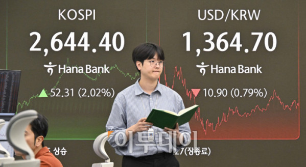 ▲국내 증시가 미국 EU(유럽연합) 관세 유예에 외국인과 기관이 동반 순매수하며 상승세로 마감한 26일 서울 중구 하나은행 딜링룸 전광판에 코스피, 코스닥, 원·달러 환율이 표시돼 있다. 이날 코스피는 전 거래일보다 52.31(2.02%) 상승한 2644.40을 코스닥은 9.29(1.30%) 포인트 상승한 725.27을 나타냈다. 원·달러 환율은 종가 기준 1364.50원을 나타내며 7개월만에 최저 수준을 나타냈다. 조현호 기자 hyunho@