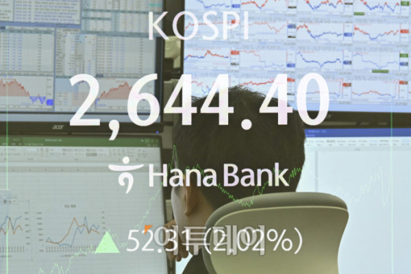 ▲국내 증시가 미국 EU(유럽연합) 관세 유예에 외국인과 기관이 동반 순매수하며 상승세로 마감한 26일 서울 중구 하나은행 딜링룸 전광판에 코스피가 표시돼 있다. 이날 코스피는 전 거래일보다 52.31(2.02%) 상승한 2644.40을 나타냈다. 조현호 기자 hyunho@
