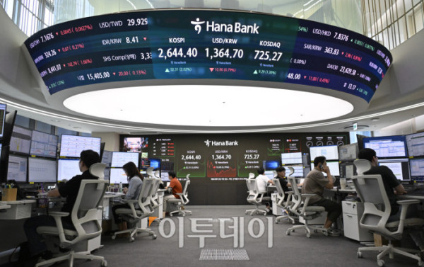 ▲국내 증시가 미국 EU(유럽연합) 관세 유예에 외국인과 기관이 동반 순매수하며 상승세로 마감한 26일 서울 중구 하나은행 딜링룸 전광판에 코스피가 표시돼 있다. 이날 코스피는 전 거래일보다 52.31(2.02%) 상승한 2644.40을 나타냈다. (다중노출 촬영) 조현호 기자 hyunho@