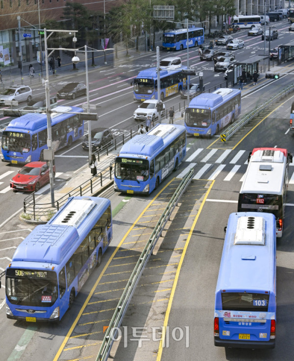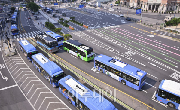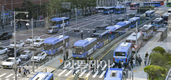 ▲서울 시내버스 노동조합의 파업 예고일 하루 전인 27일 서울 용산구 서울역버스환승센터 정류장에서 버스들이 이동하고 있다. 이날 서울 시내버스 노사는 막판 자율교섭을 진행한다. 협의가 불발되면 서울 시내버스 노조는 28일 첫차부터 파업에 돌입한다. 조현호 기자 hyunho@