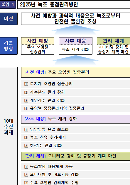 환경부는 올해 말까지 녹조 관리 체계를 사후 대응에서 사전 예방으로 전환하기 위한 '제4차 비점오염원 종합대책(2026~2030)'을 발표하고 국가 가축분뇨 관리 방향을 설정한 '국가가축분뇨종합계획' 수립 근거도 마련할 계획이다. 조희송 물환경정책관은 "녹조 발생에 대한 사전 예방과 대응을 철저히 해 국민이 안심하고 생활할 수 있는 환경을 조성하겠다"고 말했다.