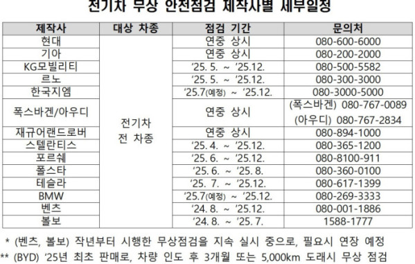 특히, 현대·기아·폭스바겐·아우디 등 일부 전기차 제작사에서는 특정 기간에 국한하지 않고 연중 상시 무상으로 안전점검을 하고 있다. 벤츠와 볼보는 작년부터 시행한 무상점검을 지속하고 있고 필요하면 연장할 예정이다.