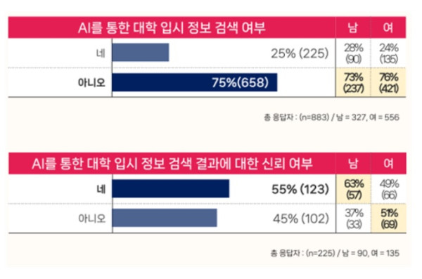 수험생 대다수는 생성형 AI를 통해 ‘대학 입시 정보 검색은 해보지 않았다(75%)’고 응답했다. 대입 정보 검색 경험이 있는 수험생에 한해 관련 신뢰 여부를 묻는 설문에는 절반 이상인 55%가 ‘신뢰한다’고 답했고, 45%가 ‘신뢰하지 않는다’고 답했다.