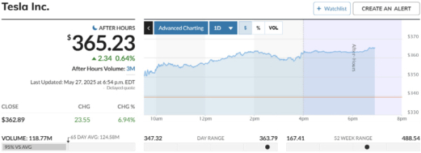 미국 전기차 회사 테슬라의 주가는 전장보다 6.94% 뛴 362.89달러에 장을 마감했다. 일론 머스크 테슬라 최고경영자(CEO)가 자신의 사업에 집중하겠다는 의사를 거듭 밝힌 것이 주가를 끌어올렸다. 그는 최근 자신의 소셜미디어 X(엑스·옛 트위터)에서 “다시 24시간 주7일 연중무휴로 일하고 회의실, 서버, 공장에서 잠을 자는 일정으로 돌아왔다”며 “중요한 기술이 출시 되고 있어서 X, xAI, 테슬라, 그리고 다음 주에 출시될 스타십에 집중해야 한다”고 말했다.