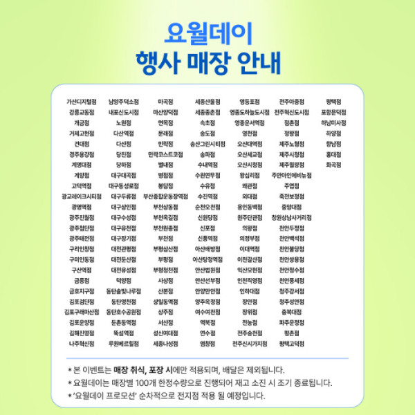 한편, 이번 요월데이 프로모션은 전국 요거트월드 가맹점 중 총 151개 지점에서 진행될 예정이며, 진행 매장은 요거트월드 공식 홈페이지와 SNS를 통해 확인할 수 있다.