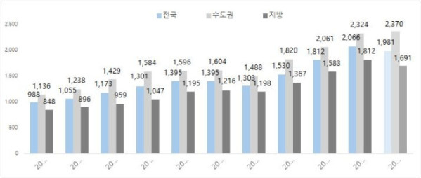 지역별로는 제주가 3.1배로 가장 많이 올랐고 대전(2.5배), 서울·광주(2.4배), 울산(2.2배), 경북(2.1배) 순으로 나타났다.