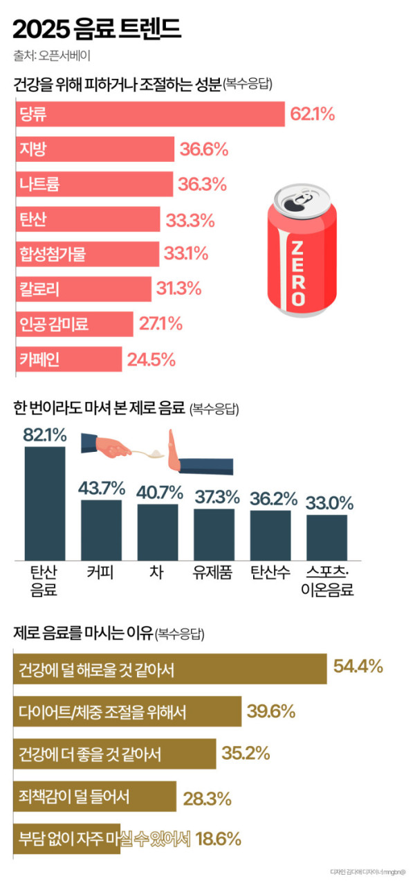 제로 음료를 마시는 이유(중복응답)로는 '건강에 덜 해로울 것 같아서(54.4%)'가 가장 많이 언급됐다. '다이어트·체중 조절을 위해서(39.6%)', '건강에 더 좋을 것 같아서(35.2%)', '죄책감이 덜 들어서(28.3%)', '부담 없이 자주 마실 수 있어서(18.6%)' 등의 답변도 이어졌다.