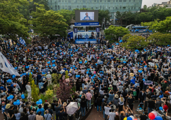▲이재명 더불어민주당 대선후보가 28일 서울 광진구 능동로 어린이대공원 정문 앞에서 유세를 하는 가운데 지지자들이 운집해 있다. 신태현 기자 holjjak@