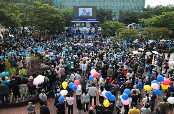 ▲이재명 더불어민주당 후보의 유세가 열리는 28일 오후 서울 광진구 서울어린이대공원 유세장에 지지자들이 운집해 있다.