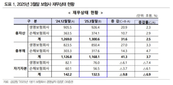 DB증권에 따르면 1분기 말 보험사의 자기자본 총계는 132조5000억 원으로, 당기순이익 4조1000억 원을 실현하고도 작년 말 대비 9조8000억 원이 감소했다.