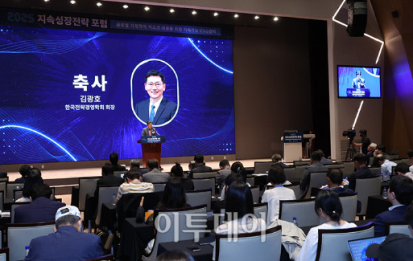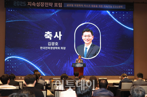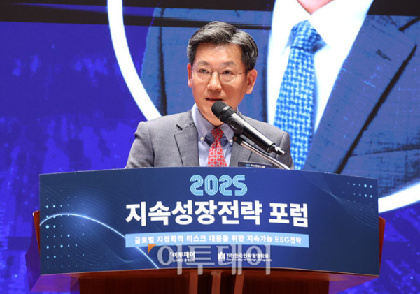 ▲김광호 한국전략경영학회장이 29일 서울 여의도 한국거래소 컨퍼런스홀에서 열린 2025 지속성장전략 포럼에서 축사를 하고 있다. 올해로 14회 째를 맞은 이번 행사는 '글로벌 지정학적 리스크 대응을 위한 지속가능 ESG전략'을 주제로 기업과 사회가 직면한 복합적 위기에 대응하며 지속가능한 미래를 모색하기 위해 기획된 자리이다. 고이란 기자 photoeran@