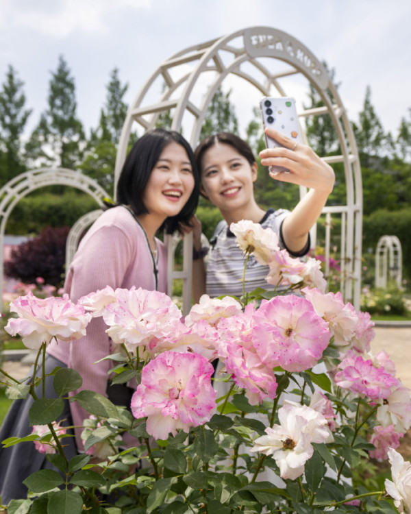 ▲상춘객들이 에버랜드 로로티 장미축제에서 인증샷을 찍고 있다. (사진제공=삼성물산 리조트부문)
