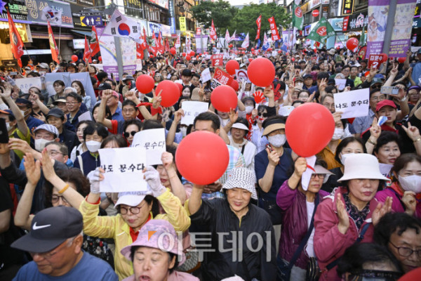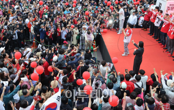 ▲29일 경기 안양시 동안구 평촌1번가 문화의거리에서 열린 김문수 국민의힘 대통령 후보 대역전의 서막, 안양 집중유세에서 지지자들이 김 후보를 연호하고 있다. 조현호 기자 hyunho@