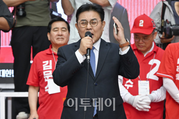 ▲전병헌 새미래민주당 대표가 29일 경기 안양시 동안구 평촌1번가 문화의거리에서 열린 김문수 국민의힘 대통령 후보 대역전의 서막, 안양 집중유세에서 김 후보 지지 선언을 하고 있다. 조현호 기자 hyunho@