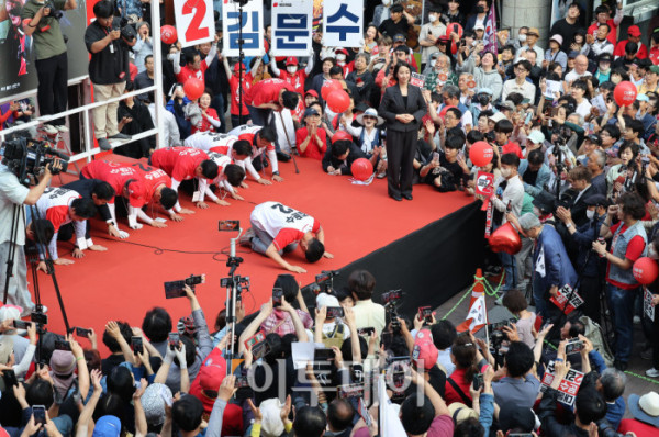 ▲김문수 국민의힘 대통령 후보가 29일 경기 안양시 동안구 평촌1번가 문화의거리에서 열린 대역전의 서막, 안양 집중유세에서 시민들에게 지지를 호소하며 큰절을 하고 있다. 조현호 기자 hyunho@